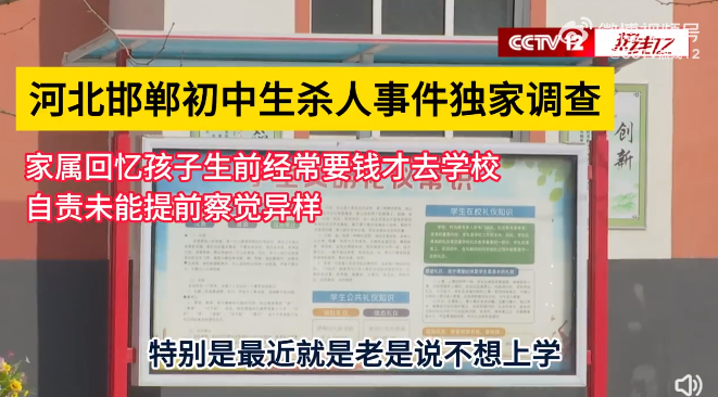 据CCTV《热线12》栏目官方微博报道,被害人姑姑提到,孩子最近老是说不愿意去上学,要钱才愿意去学校,“必须得拿5元、拿8元、拿10元,拿了就很高兴地去上学,咱们以为孩子就想买好吃的,没想那么多……现在回想,都是有点异样的。”