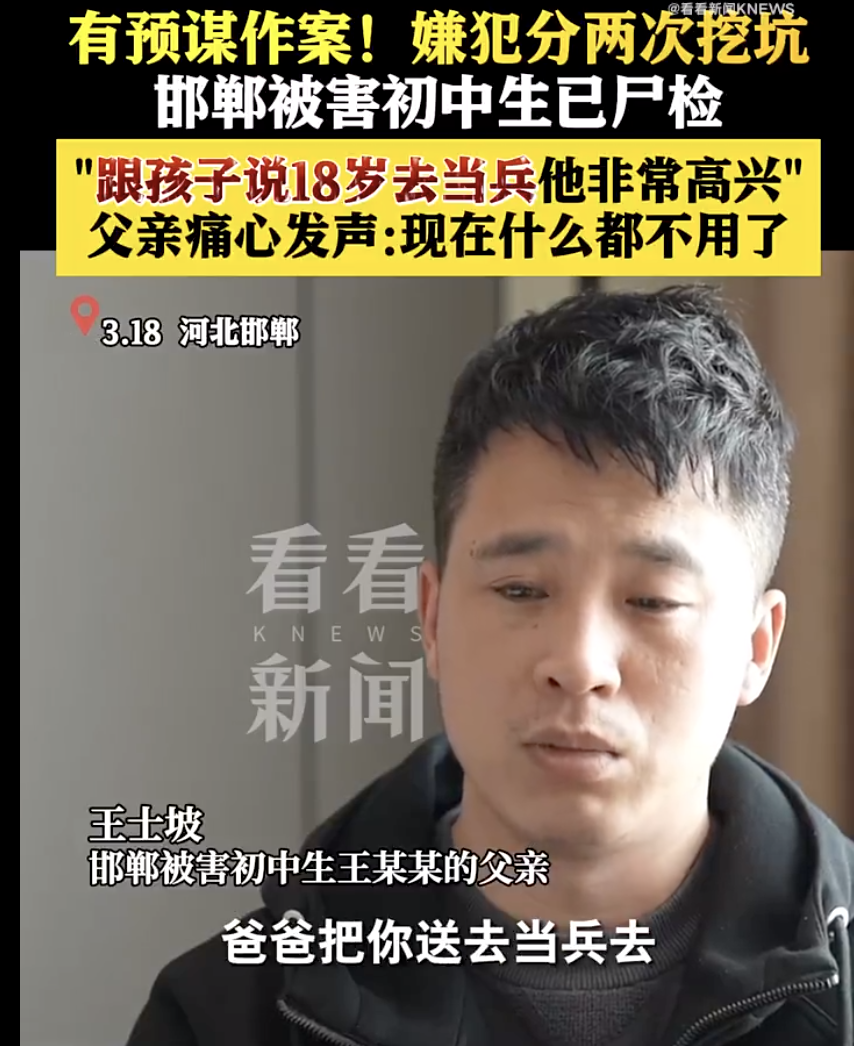 被害初中生王某某的父亲王士坡受访时表示,“跟孩子说18岁去当兵,他非常高兴,还给他看了阅兵的视频,看军人走姿,跟他聊规划聊未来。但现在什么都不用了......”
