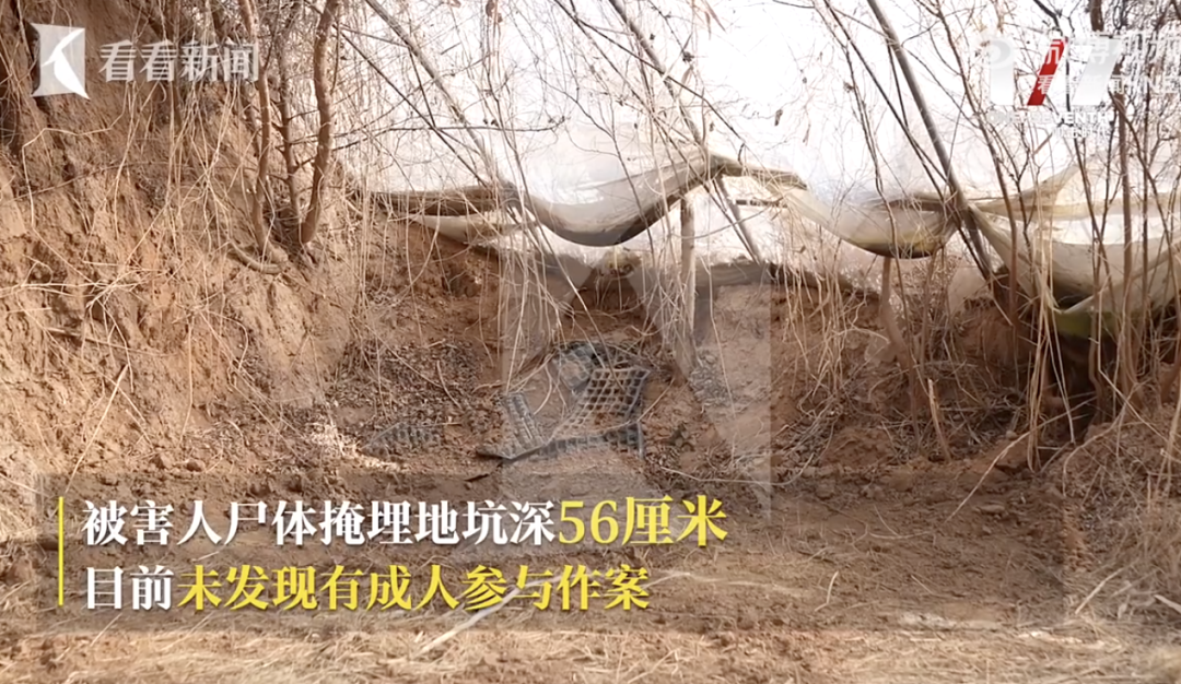 警方透露,为了掩埋尸体,犯罪嫌疑人分两次在废弃大棚内挖掘,被害人尸体掩埋地坑深56厘米,目前未发现有成人参与作案。