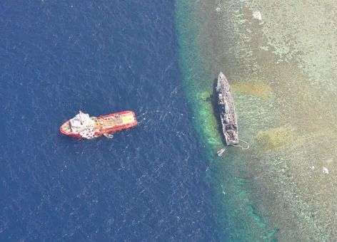 图为美国一艘反水雷舰在菲律宾海域搁浅,为了避免对当地珊瑚礁造成破坏,船只最终拆解后脱离(图片来源:restoration.noaa.gov)