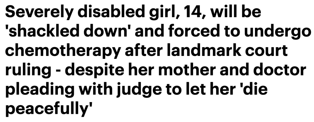 在这则判决下,这名患有严重癫痫的14岁女孩必须屡次被“约束”在病床上接受化疗,尽管她的母亲向法官请求,“让她平静地死去”。
