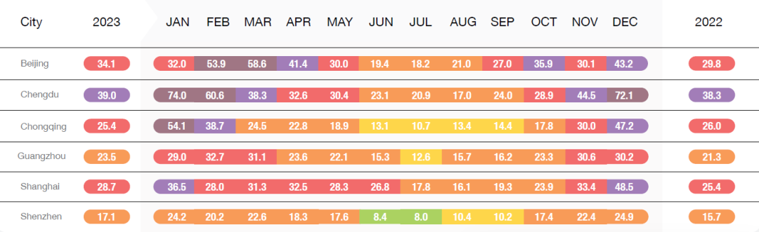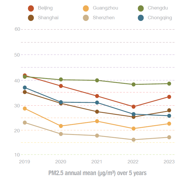 中国内陆城市年均PM2.5浓度在连续5年逐年递减后,于2023年首次增加,达到32.5µg/m³,与2022年相比增长了6.3%。