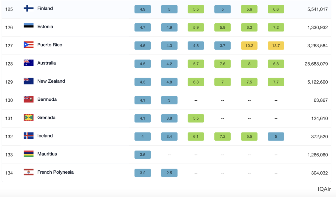 全球仅7个国家达到世卫组织PM2.5浓度指导标准(≤5µg/m³),只有澳大利亚、爱沙尼亚、芬兰、格林纳达、冰岛、毛里求斯和新西兰达到了这一标准。