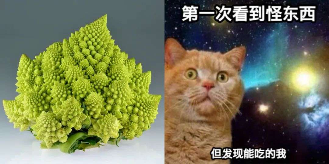 它的“花蕾”看起来像一个个宝塔组成的,而这一个个宝塔又构成了一个大宝塔,大宝塔又构成了一个更大的宝塔……这种自相似的模式带来的视觉效果十分丰富。而每一簇小宝塔的螺旋,其实都是按照斐波那契螺旋线进行排列的。