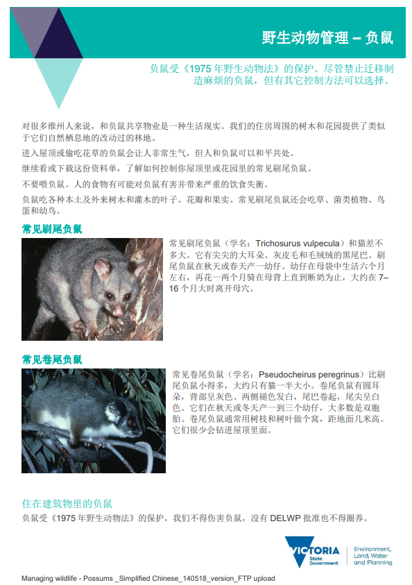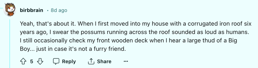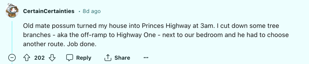 “每晚11点到凌晨4点,总有一只负鼠从高高的橡胶树上跳下,撞到卧室外阳台的金属屋顶上。”“这混蛋听起来像炸弹一样。昨晚我们还以为是树枝断了掉下来了呢,原来是那只胖负鼠。”“我在这里住了很多年,很多负鼠在晚上疯狂地尖叫,在院子里到处拉屎,在东西上撒尿,我早就习惯了他们在屋顶上乱窜。”“但这个胖子是个真正的混蛋,每晚每隔几个小时,等待它的轰鸣降落让我的神经紧张。”对此,评论里有网友开玩笑道:“让负鼠白天保持清醒(它晚上就困了) ”“对着困困的负鼠大喊大叫,再问问‘你喜欢这样吗’?”“六年前,当我第一次搬进有波纹铁屋顶的房子时,我发誓穿过屋顶的负鼠的声音听起来和人类的一样大。”“凌晨 3 点,老伙计负鼠把我的房子变成了王子公路。我砍倒了我们卧室旁边的一些树枝——也就是一号公路的出口匝道——他不得不选择另一条路线。驱赶完成。““2018年是我与负鼠的战争之年。搬进新租的房子,却发现屋顶空洞里躲着一群负鼠。真的是打架、尖叫、撒尿、在我头顶上跑了一整晚。““负鼠在穿过街道时,总是在电线上跑来跑去。这些胖子会轻而易举地在粗麻绳上攀爬。”不得不说这澳洲的生态有点过于好了,小动物们经常不请自来,让你被迫与它们“同居”。严格来说,澳洲负鼠并不能称之为负鼠,它应该是袋貂,但华人习惯将其称之为负鼠,现在维州政府的中文资料中也将其翻译成负鼠。它们通常会在天花板和墙缝中筑窝。一项研究发现,87%的负鼠窝都建在建筑物中(大多是老房子),其中45%都是在屋顶的缝隙中。更令人无语的是,它们还很喜欢在夜间行动,不仅发出的声音很吵,而且还会在天花板上吃喝拉撒,散发出各种臭味。可是,就算它们这么讨厌,你还真不能拿它们怎么样——澳大利亚的野生动物保护法规定,负鼠有权在澳大利亚的城市中生活。维州还将一种比较稀有的利德比特负鼠(Leadbeater's possum)封为州动物象征,5年内还要拨款1100万澳币来保护这种动物,不然20年后,就再也见不到这种萌萌的物种了。所以,你可别因为它们太烦,就随意捕捉它们,一不小心就犯法了!那难道我们就这么坐以待毙,等着负鼠们来自己家里开Party吗?目前,还是有一些方法,至少可以防范负鼠破坏家里的花园植被的——在植物附近放上装着泡茶的容器。 比如,Lapsang souchong 茶就有很浓的烟熏味,负鼠很讨厌这味道。如果想要更强力一点的东西,可以拿一只旧袜子,然后在里面装满少量的血和骨肥即可。 确定负鼠进入花园的主要入口,并固定好“臭弹”,可以阻止它们进入花园。(不过有把自己熏到的风险,慎用哦!)如果茶或臭弹的气味不足以阻止负鼠,你可能需要在你的花园里安装一个防护网系统。 鸟网可以阻止负鼠,因为负鼠没法在网上攀爬,但它们可以弄破网。 为了阻止负鼠在地上挖掘,网需要埋入地下约 30 厘米深。有网友支招说,自从在花园里安装了一些太阳能 LED 花蕾灯后,就根本没有看到负鼠,而且灯在晚上看起来非常漂亮。此外,另一位网友想出了一种使用鱼油阻止负鼠吃玫瑰芽的方法。