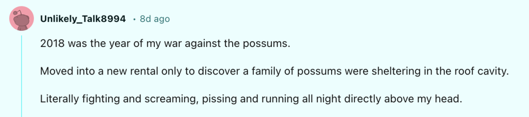 马上快到4月了,又是负鼠繁殖的季节,澳洲的居民们可能要因此苦恼了。最近,Reddit上一篇关于烦人负鼠的帖子引起了不少共鸣——