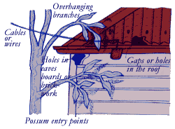 建一个只出不进的阀门,先让负鼠出来,然后砍树枝,让负鼠无法再跳到屋顶上,然后给树也围个滑滑的围脖,防止负鼠攀爬。