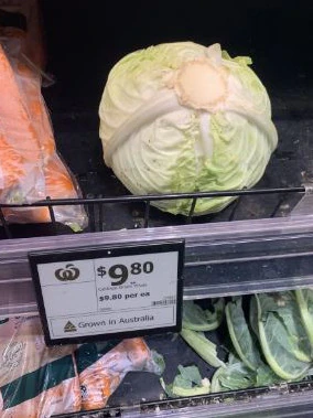 另一位购物者看到照片会后也抱怨这种受欢迎的蔬菜的价格,因为他注意到在Woolworths一棵卷心菜要9.8澳元。