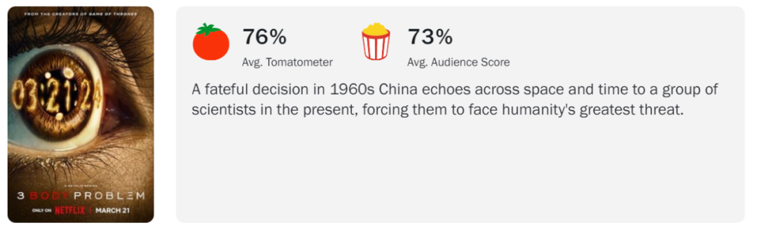 各大电影网站开分后,IMDb评分7.7,烂番茄新鲜度76%,爆米花指数只有71%,从过往标准看,口碑不算多好,及格分往上一点。