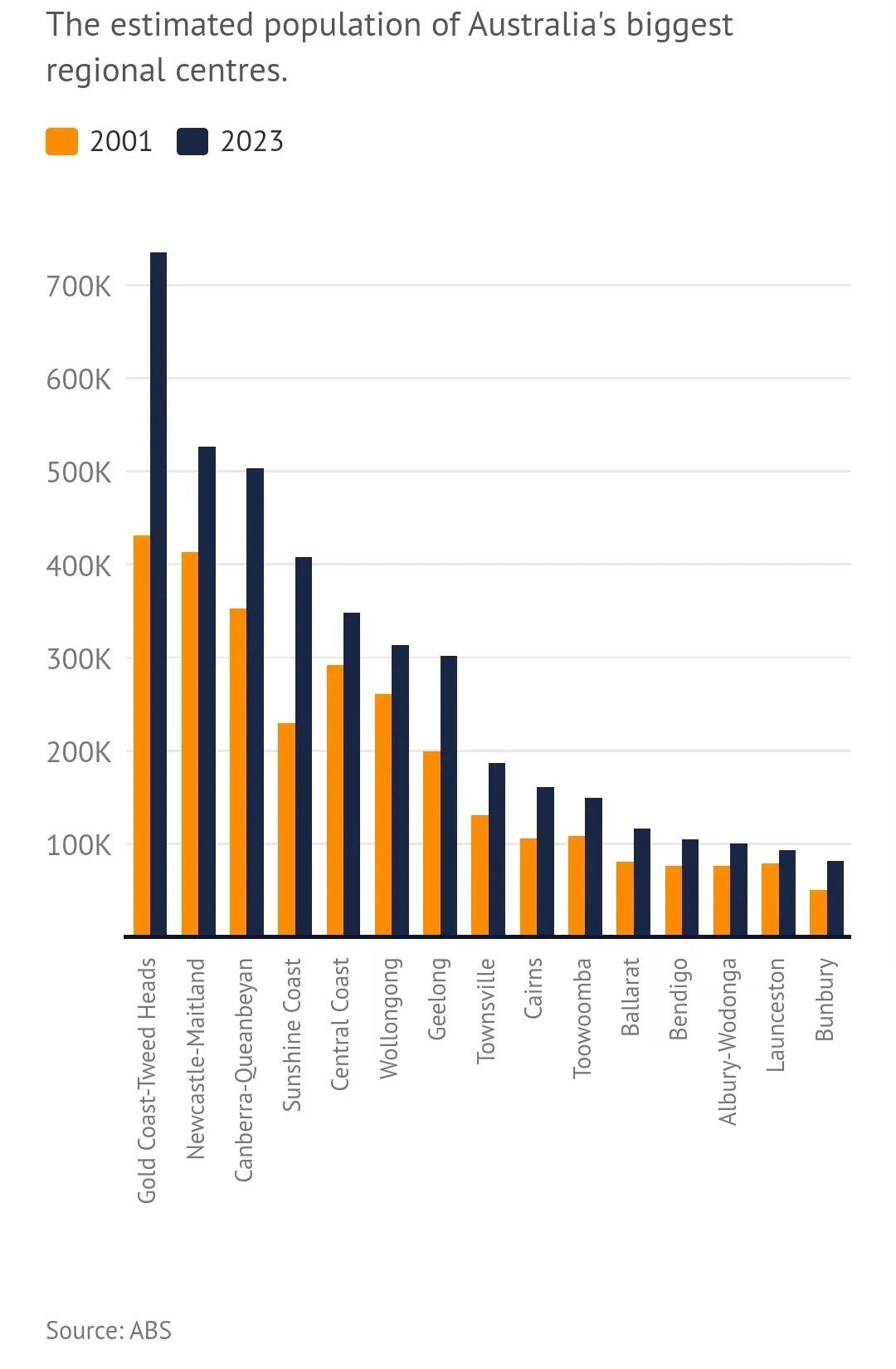 堪培拉-昆比恩(Canberra-Queanbeyan)现在有50多万居民,而奥尔伯里-沃东加(Albury-Wodonga)是第13个人口超过10万的地区中心。