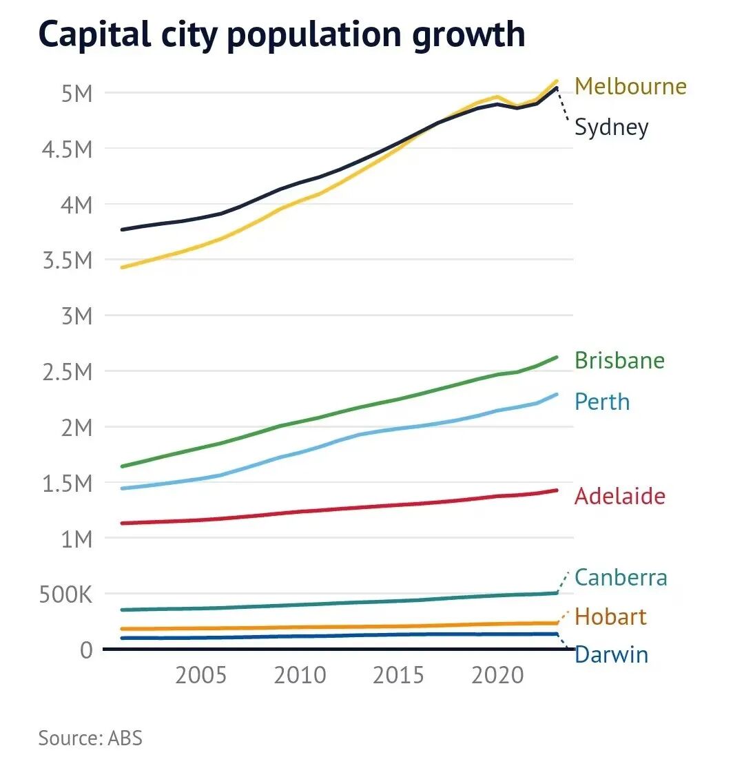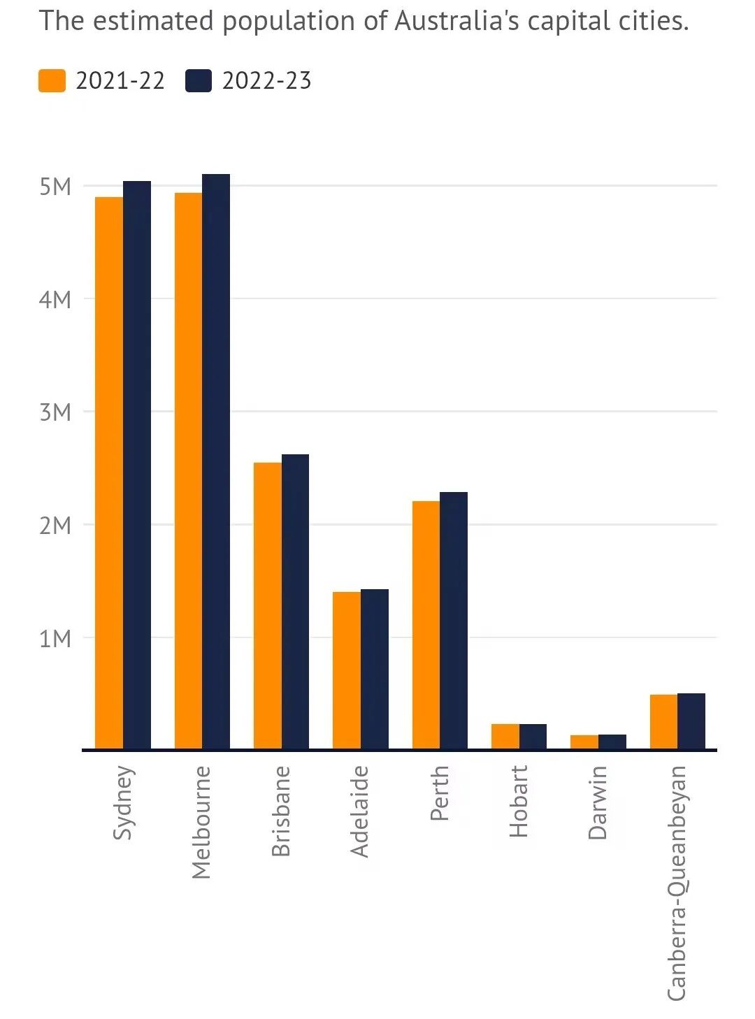就其他首府城市而言,墨尔本人口在 2022-23 年间激增 16.6 万,现已超越悉尼成为全澳最大城市。悉尼 2016 年人口增长 90,109 人,新增居民 142,600 人。