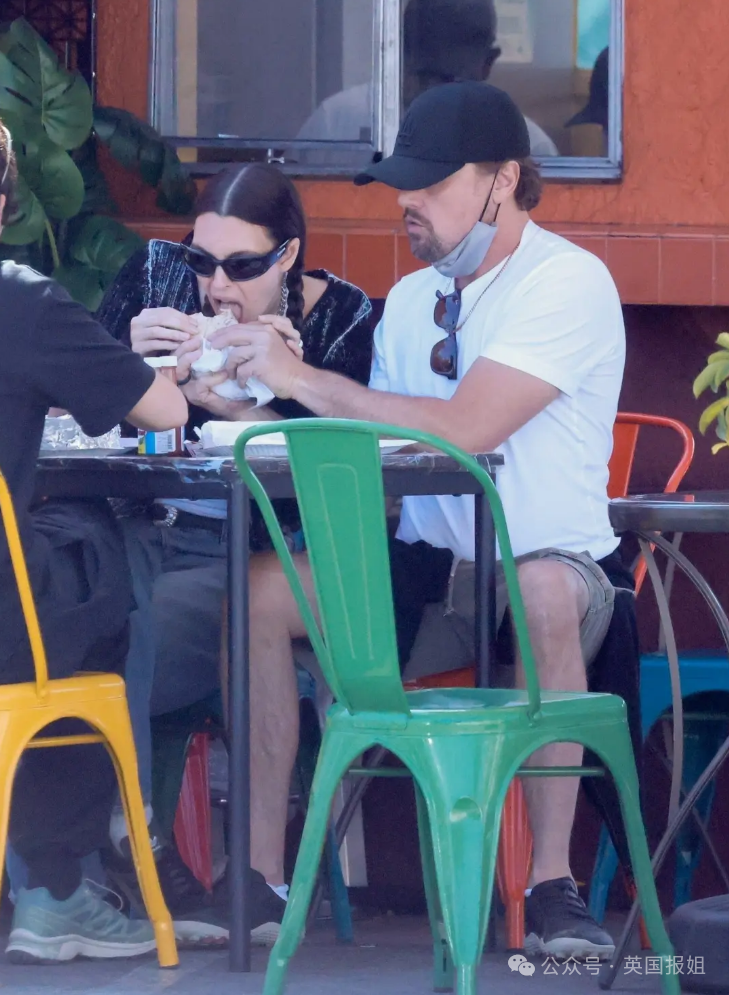 两人在吃饭时亲密互动,小李子甜蜜地将墨西哥卷饼喂给女友。
