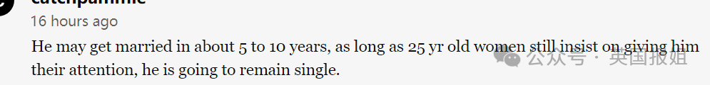 “他结婚可能还得5到10年吧,只要25岁的女性依然愿意关注他,他就会一直保持未婚。”