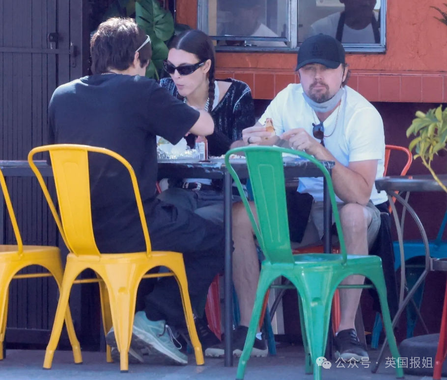媒体曝光的照片中,小李子身穿休闲白T配短裤,头戴祖传棒球帽,口罩拉到下巴处,在吃饭时都全程佩戴。