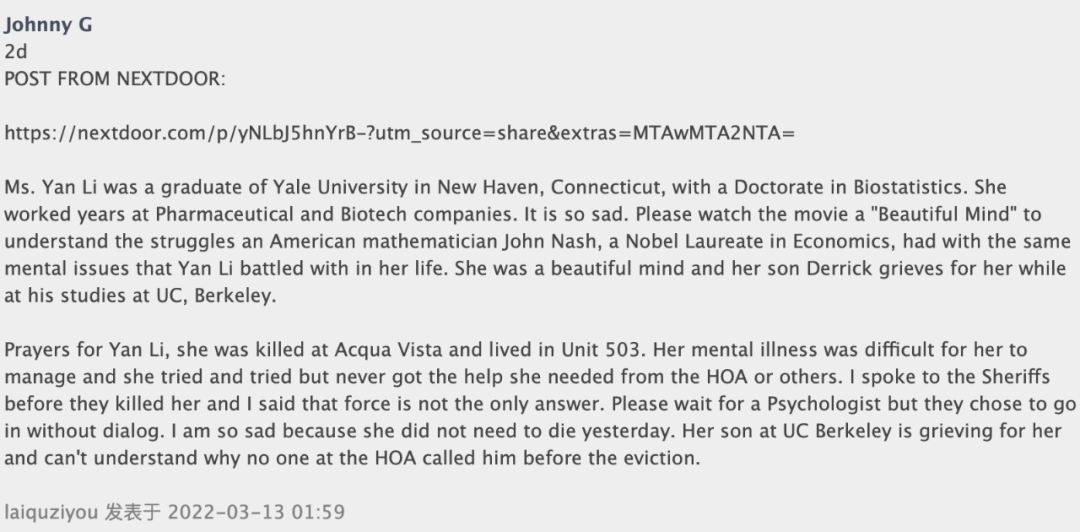 3月3日,47岁的华裔女子李艳(Li Yan)在美国加州圣地亚哥公寓,被前来送驱逐通知的警员乱枪射杀。