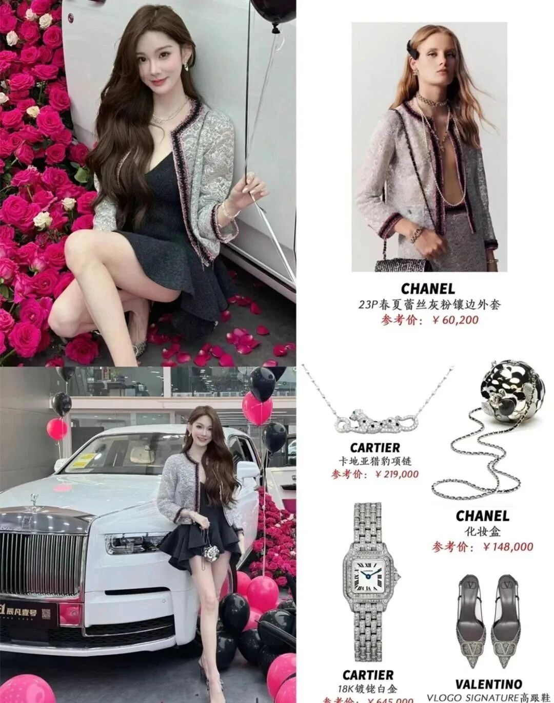 一件小小的外套已是23P春夏蕾丝灰粉镶边外套,价值6万。化妆盒高达15万,卡地亚项链接近22万,右手上的手表已达65万。