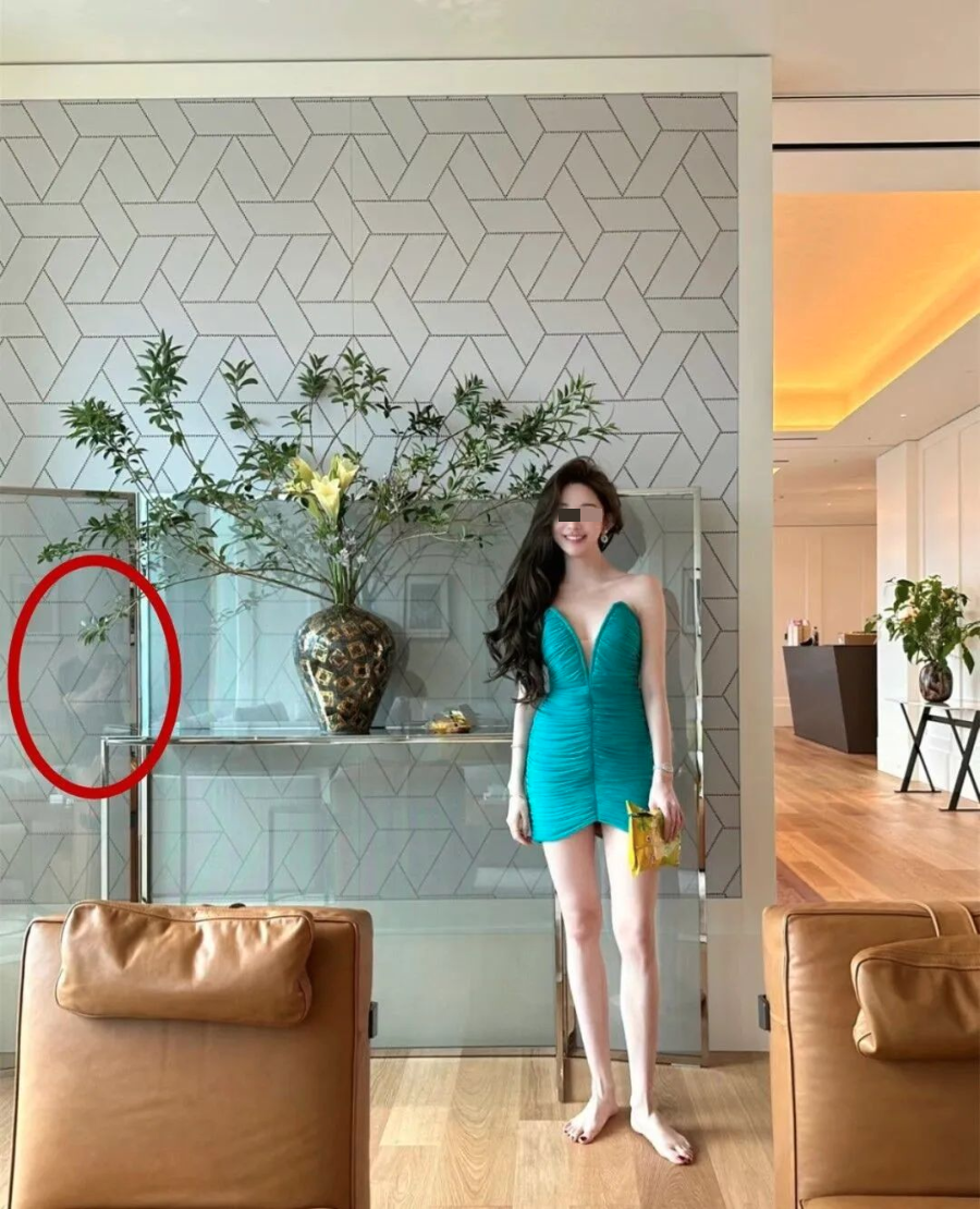后来,大家更是在花三三分享过的豪宅私拍照中,发现了玻璃门中倒映出来的疑似该富豪的身影。