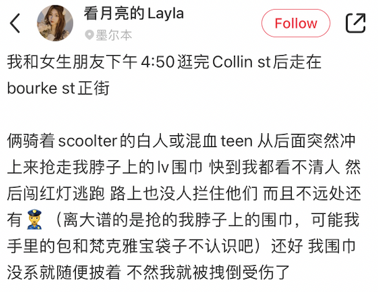 这位女生曝光称,自己跟朋友在Bourke Street逛街时,两个骑着电动滑板车的澳洲青少年突然从背后冲了出来,一把抢走了女生的LV围巾。