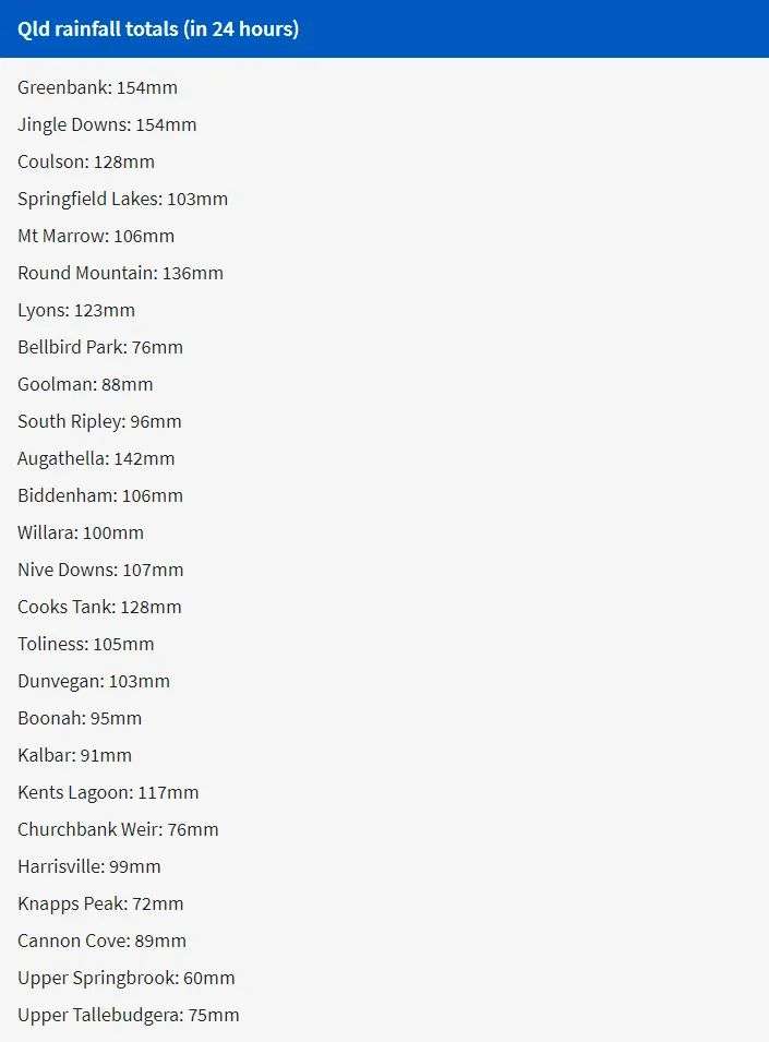 周四,一股极其潮湿的气团开始与延伸穿过north Maranoa地区并进入Darling Downs的近静止低槽相结合。周三夜间的强降雨夺去了Greenbank一位父亲Peter Wells的生命。预计在未来48小时内,风暴冲突将给南部内陆地区和部分沿海地区带来缓慢移动的风暴、强降雨和危险的山洪暴发。海岸线附近还可能同时形成数个"水龙卷",可能出现危险的海浪,破坏性风速可达每小时100公里。气象局高级气象学家Felim Hanniffy称,正在穿过昆州内陆向新州移动的高空低压系统可能会静止数日。这个螺旋式上升的系统在与沿海低槽发生冲突时,预计将吸入大量水汽,并在东南部造成瀑布式降水。Hanniffy说:"其连锁反应将使昆州南部降雨量更大。"这两个系统可能会带来100毫米左右的孤立降雨,周五和周六,处于两个系统火线的沿海地区降雨量可能会超过200毫米。内陆地区周四和周五的降雨量可能最大。"今天内陆地区的降雨量可能会超过100毫米,Darling Downs的西半部和Warrego的东半部风险最大。"Hanniffy敦促度假者注意天气预报,查看道路关闭情况,根据路况调整驾驶,切勿在洪水中驾驶。