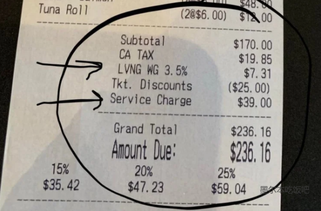 当然不管收服务费出于什么目的,最终羊毛出在羊身上,作为消费者用餐之前餐厅应该告知是否额外收取服务费和税费,或者菜单上应该注明。如果消费者没有被告知,结账时发现多了10%-20%的税费/服务费,那消费者可以拒绝支付。