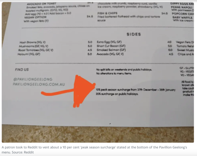 再比如墨尔本的网红餐厅Pavilion,还搞出了一个新名堂——“旺季附加费 peak season surcharge”。