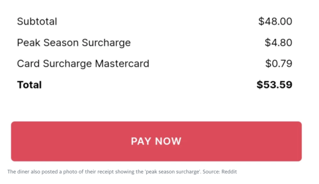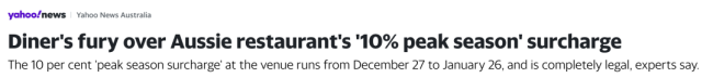 一名食客在圣诞节后与朋友外出就餐时,发现一家餐馆收取10%的“旺季附加费”,他对此表示“现在的餐厅是想钱想疯了吗?”。