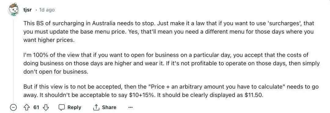 还有吃瓜网友提道,“澳洲这种收取附加费的离谱行为必须结束了!”