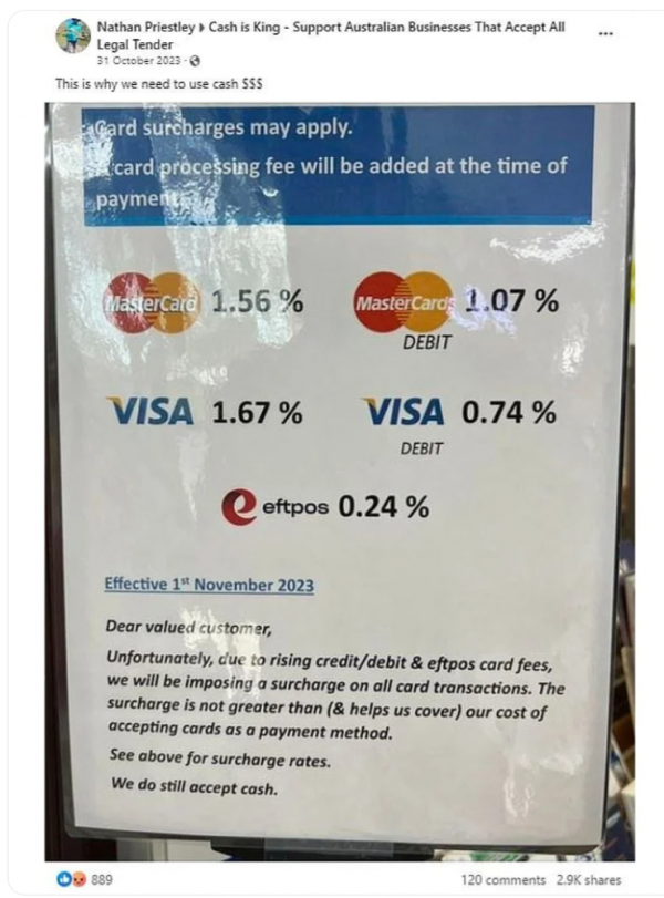 根据澳大利亚储备银行制定并由澳大利亚竞争与消费者委员会执行的规定,企业不得收取高于处理特定类型付款成本的附加费。