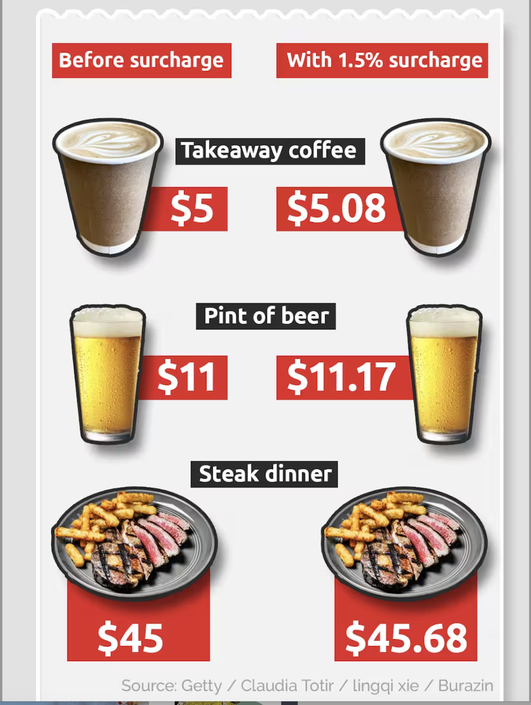 因此,如果你花5澳元买一杯外卖咖啡,再加上1.5%的附加费,这笔交易总费用将达到5.08澳元(假设四舍五入)。