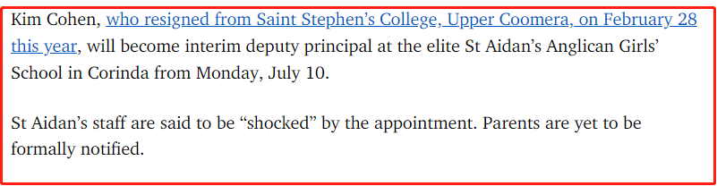 2023 年 7 月,Kim Cohen 因被指控营造不安全的工作场所而从黄金海岸的Saint Stephen’s College离职。