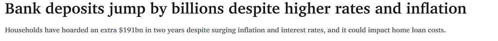 RateCity研究主管Sally Tindall说:“在经历了多年的通胀飙升和13次加息之后,家庭存在银行里的钱仍然不降反升,这实在令人震惊。”
