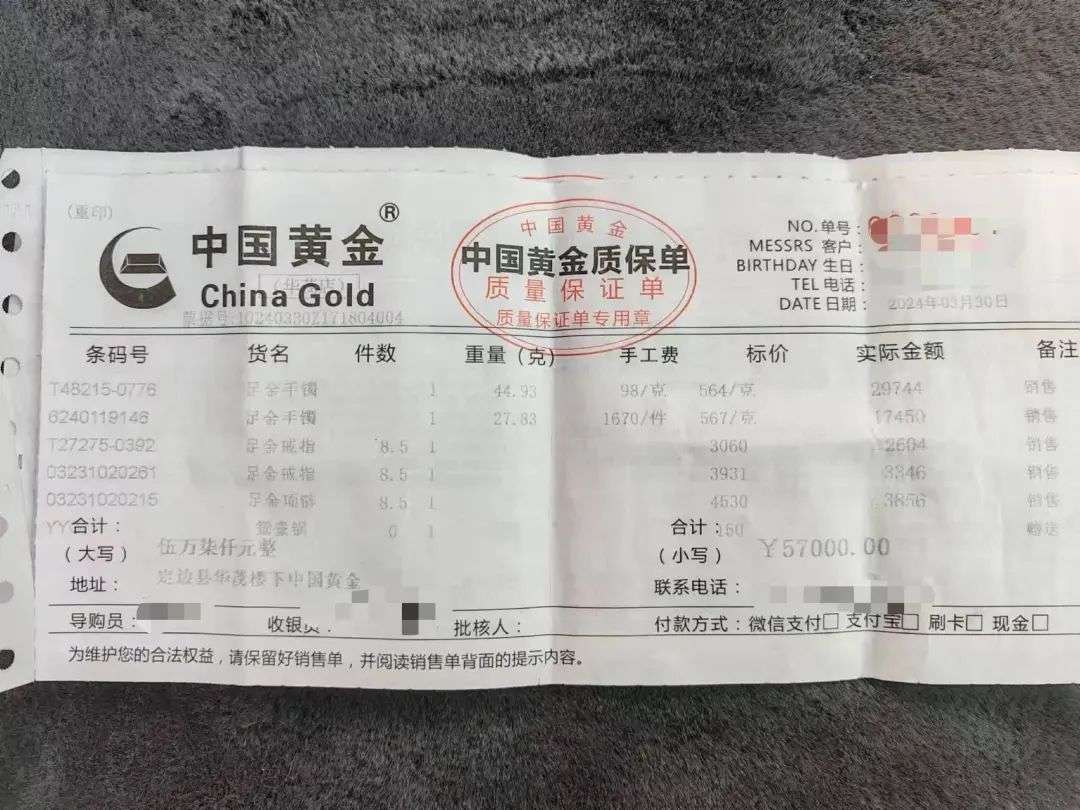根据《中国黄金质保单》显示,张先生购买了2件足金手镯、2枚足金戒指、1条足金项链、1对足金耳饰等。共计花费58800元。