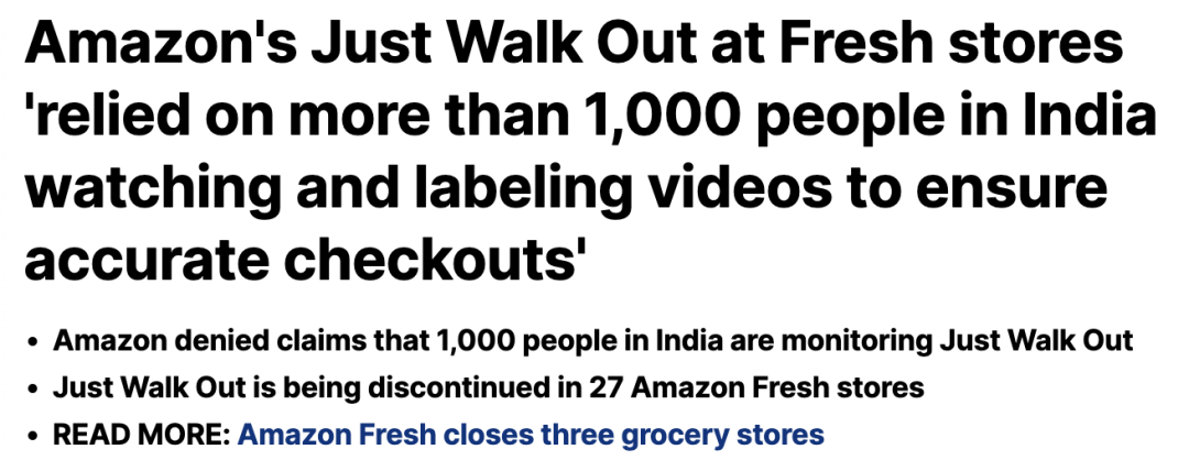 有媒体曝光,称这项可以让消费者随意进出商店、拿了商品直接离开、系统自动结账的尖端技术背后,暗藏了1000多名廉价印度劳动力。这些印度员工薪水微薄,藏在人工监控后观察着“无人商店”内顾客的一举一动,看似系统自动结账,实则远程“人眼验货”。