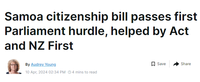 昨晚,新西兰一项关于公民身份的法案通过一读,震惊国会。