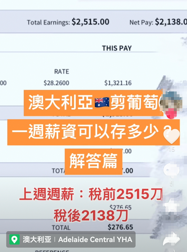就在今天,还有澳洲博主晒出了自己剪葡萄一周的税后收入: