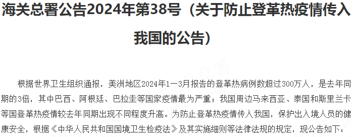 与此同时,中国海关也发布了一份关于防止登革热疫情传入国内的公告: