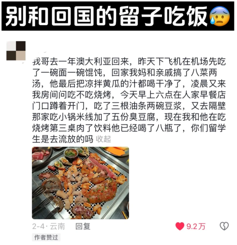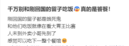 最近有一个帖子在小红书上非常火爆,一位网友表示,千万别随便和刚从澳洲回国的留学生一起吃饭,可能会被对方的食量彻底惊呆。这位博主表示,感觉一个留学生能吃下一整个餐馆,完全就是大胃王比赛的既视感。