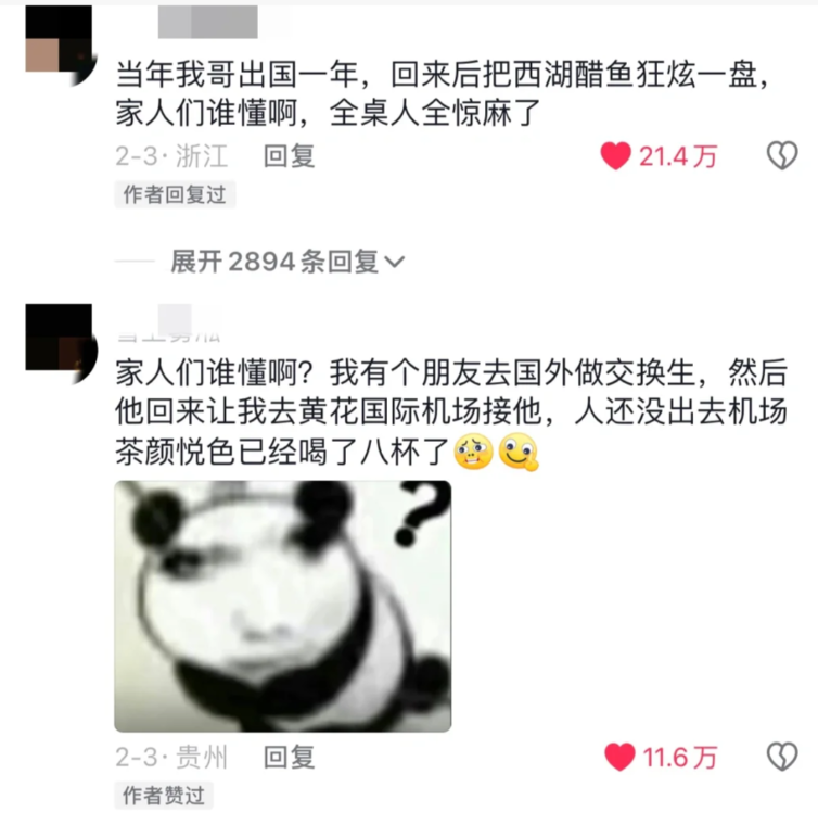 类似的截图还有很多,基本都是留学生回国各种狂炫的介绍,还有人连西湖醋鱼这种知名难吃的东西都能面不改色吃下一盘。