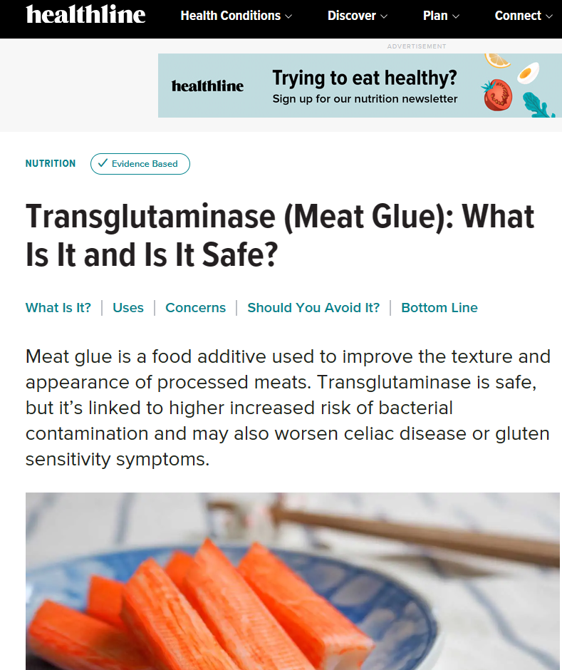 而健康信息网站 Healthline 表示,转谷氨酰胺酶(俗称肉胶)是一种食品添加剂,用于改善加工肉类的质地和外观。