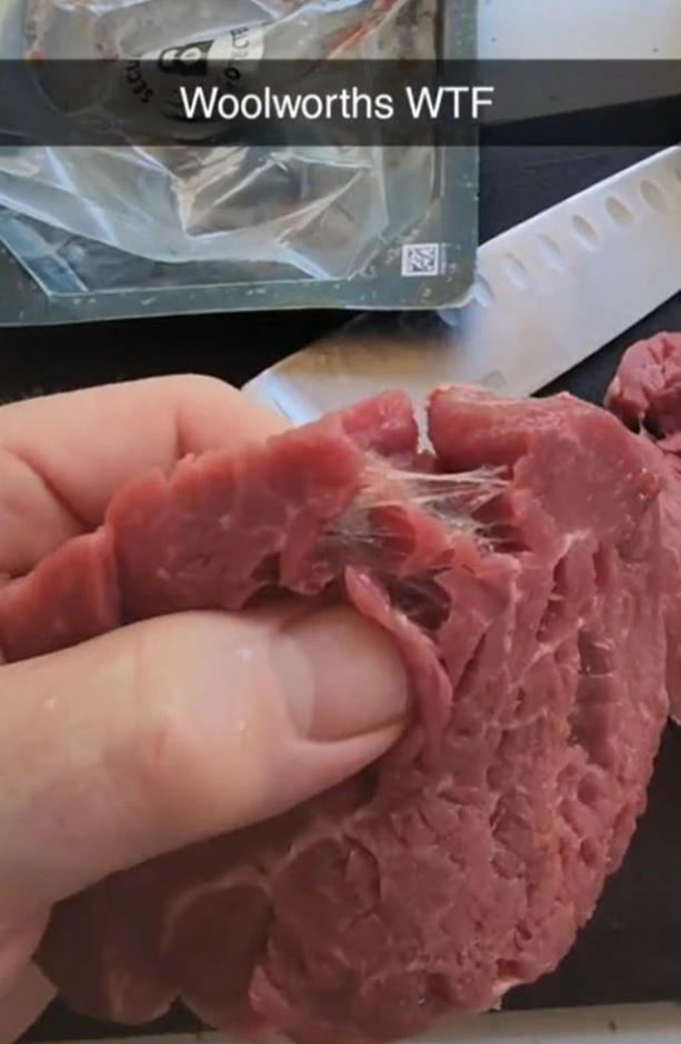 该男子声称这是“肉胶”,但 Woolworths 已向媒体解释了,购物者的说法是错误的,并向顾客保证:牛排是“整块”出售的。