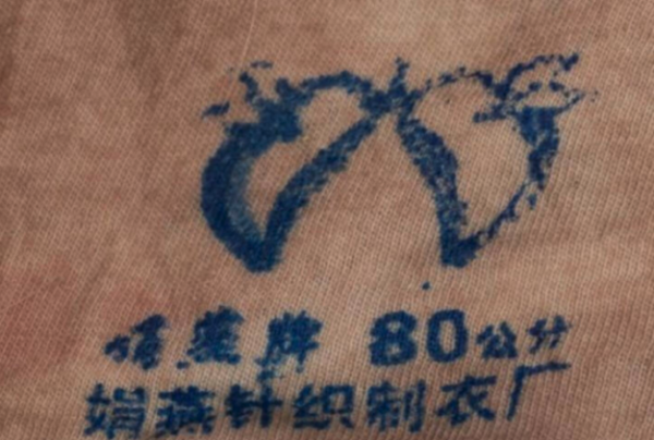 针织背心为赭色,写着中文“娟燕牌 80公分”和“娟燕针织制衣厂”。