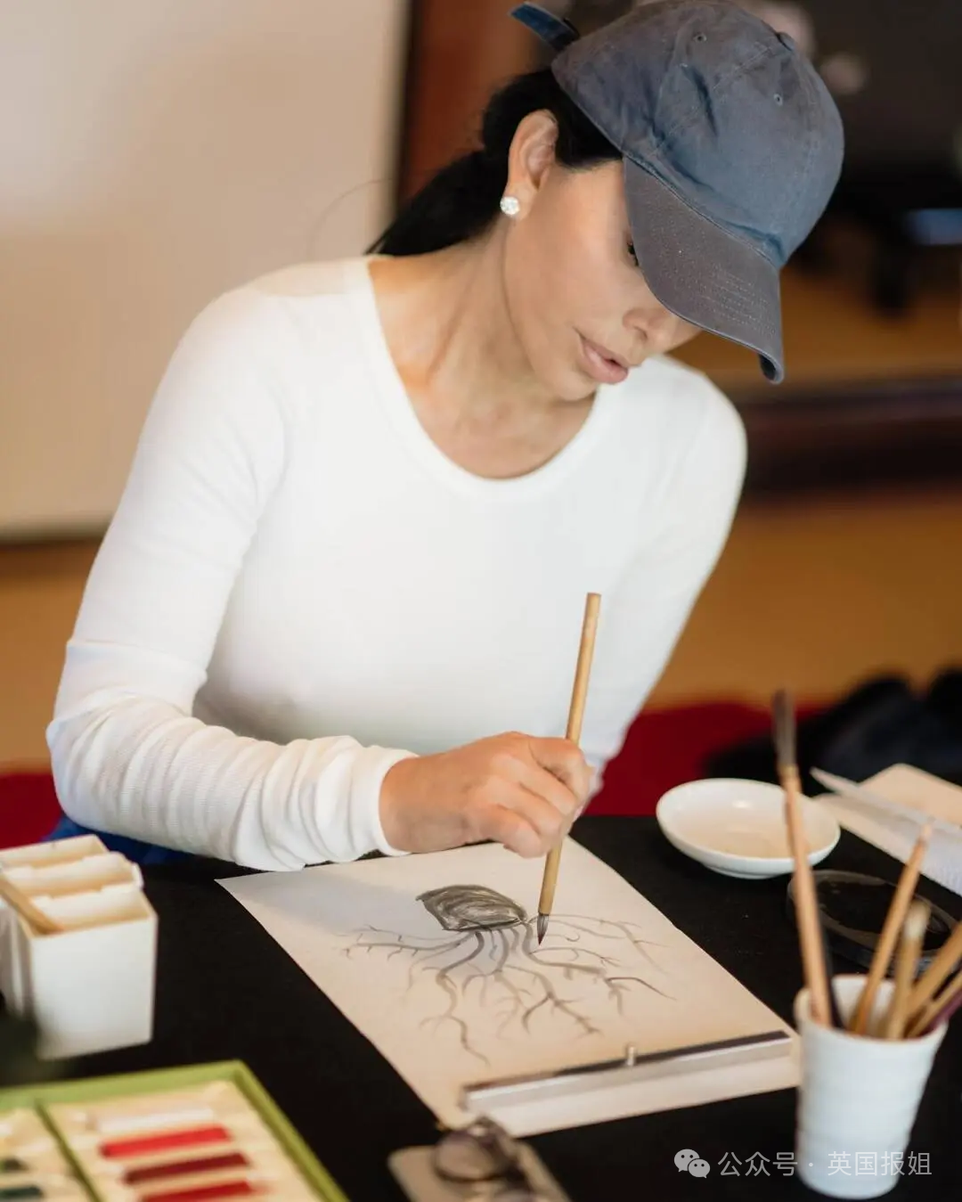她还特意发了自己用毛笔画画的照片,以及贝索斯小跑着踩着石头过河的背影……