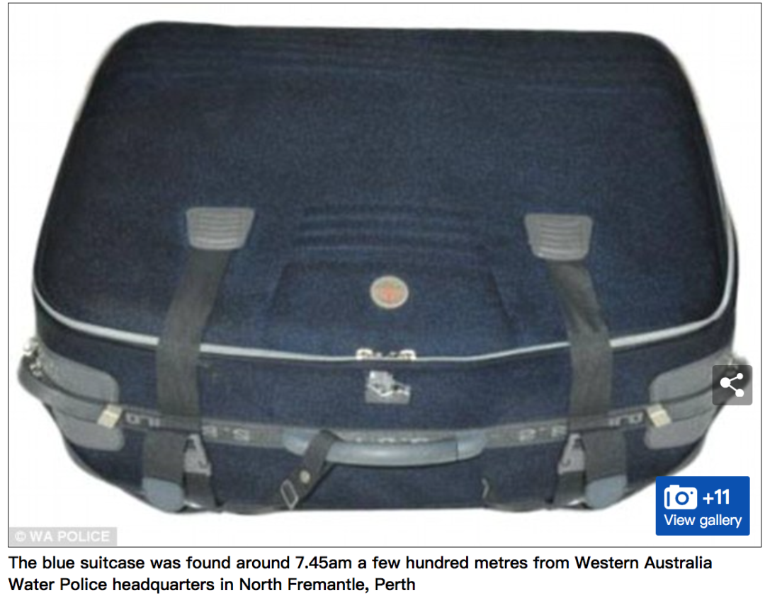 警方介入后,发现亚历克斯打捞的行李箱里装着一具下半身几乎完全暴露的女尸,尸体上身穿着一件迪士尼的T恤和一件无袖的蓝色马甲,已经被泡得肿胀,面目全非很难马上辨认身份。