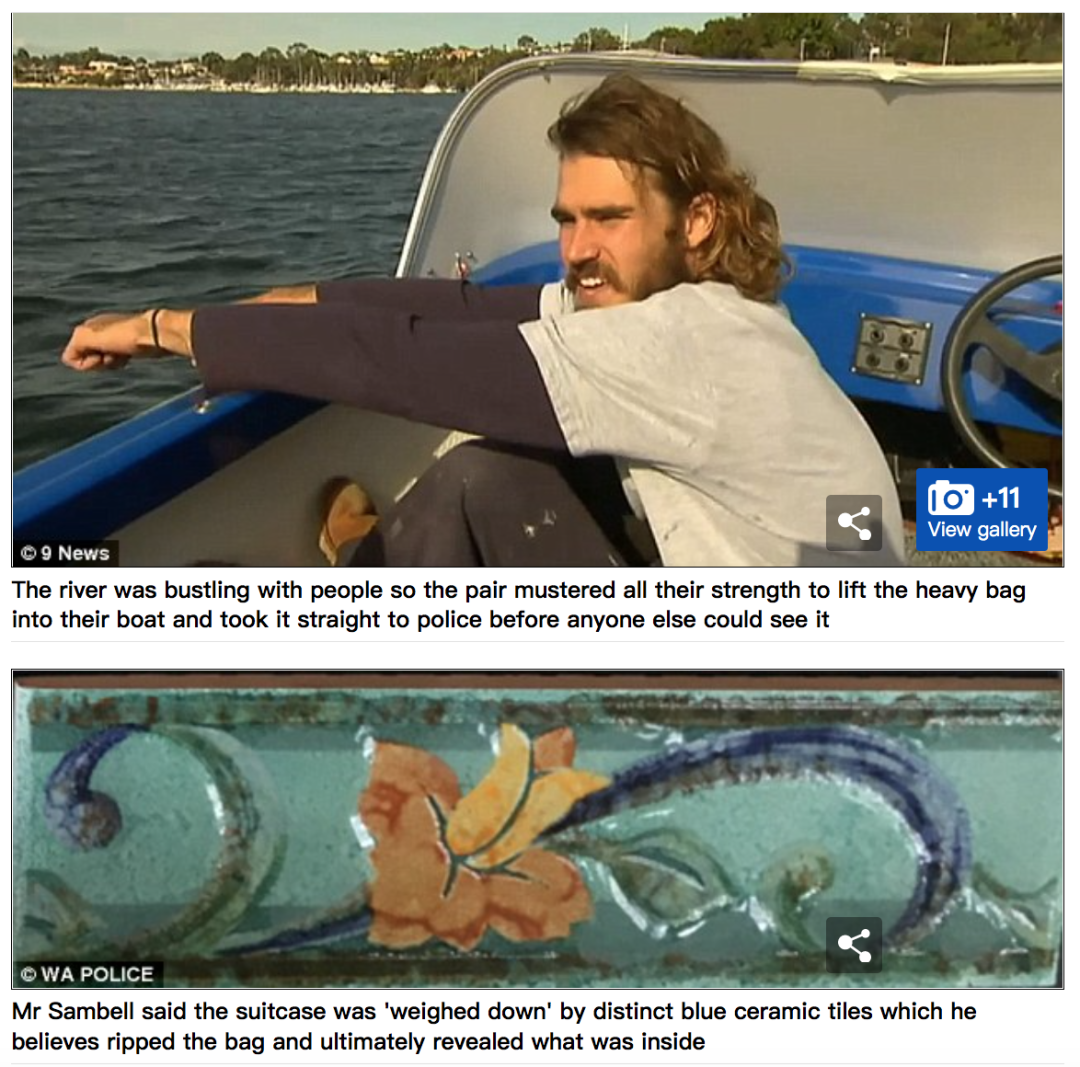 于是珀斯警方派出潜水员,到河中打捞证物。果不其然,他们找到了凶手抛尸留下的物件——一个挂着菜板的滑板车和一副黑框眼镜。