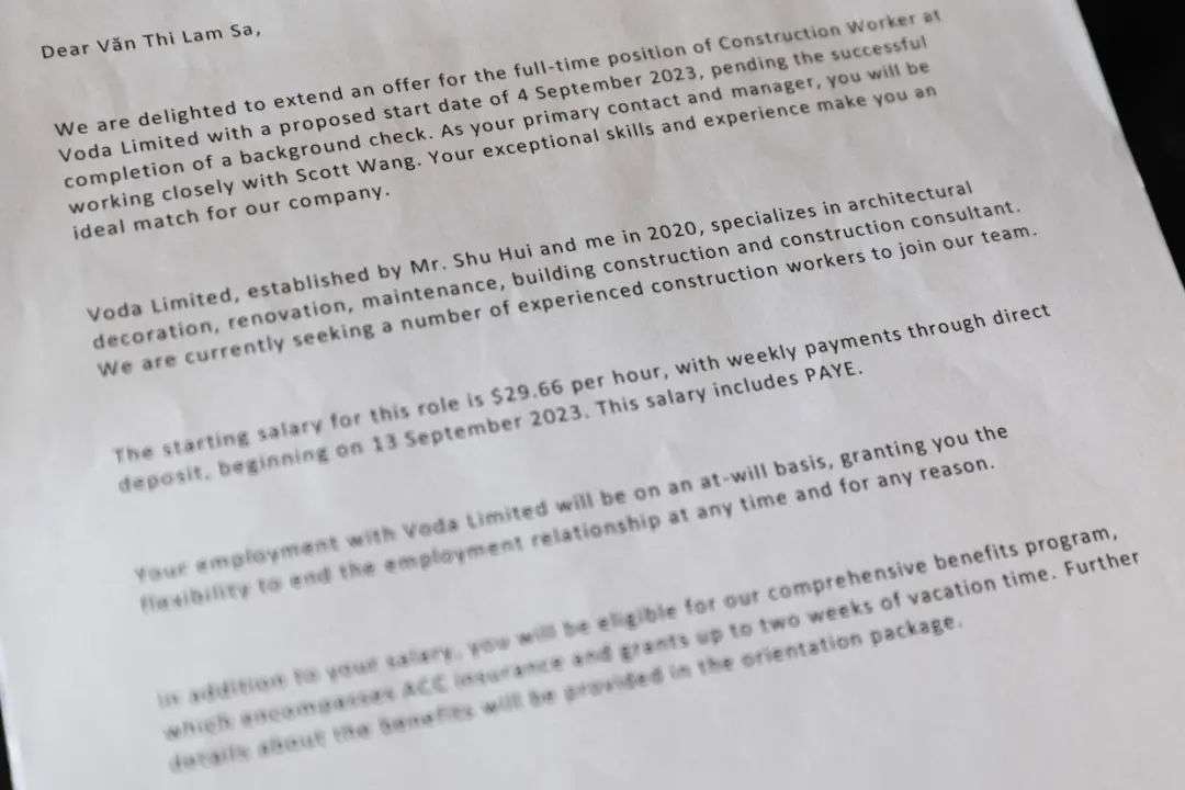 Van的工作签证显示,她在Voda Limited的职业是一名全职建筑工人,每小时工资为29.66纽币,开始日期为2023年9月13日。