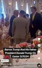 巴伦和特朗普还有梅拉尼娅一起出席在海湖庄园举行的复活节晚餐。从拍到的视频和照片中可以看到,巴伦基本上全程都站在他的父母身边。他坐在母亲旁边,与客人共进晚餐,似乎正在等待食物上桌。也可以看到他站在特朗普旁边,特朗普在与一些客人交谈。