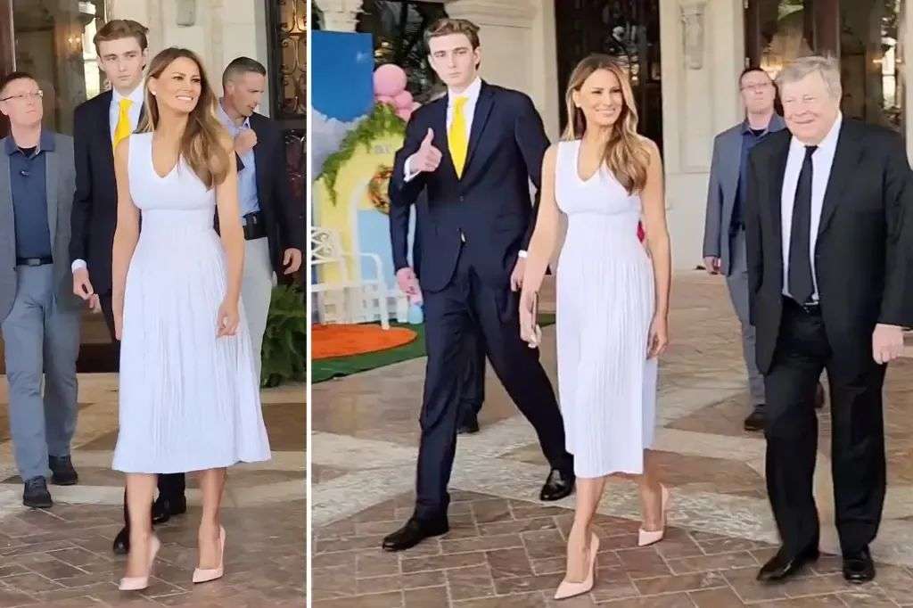 巴伦走在母亲梅拉尼娅的身后,虽然高大,但看上去非常乖巧。梅拉尼娅是一身飘逸的白色连衣裙,面带微笑,容光焕发。