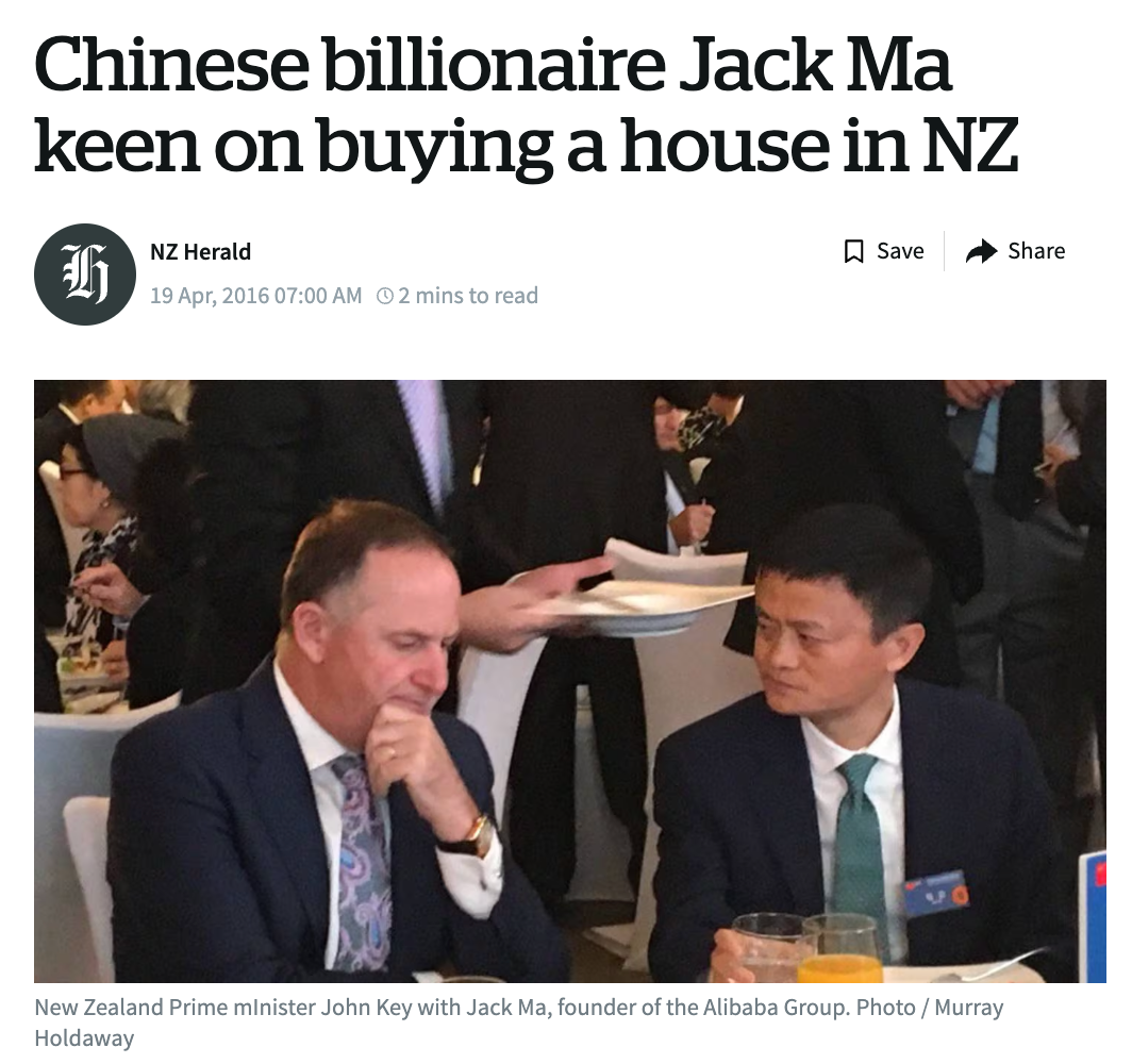 而早在2016年,马云就曾表示他想在新西兰买房。