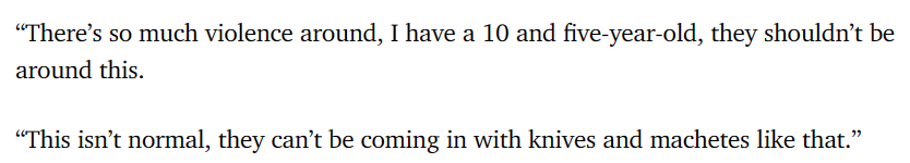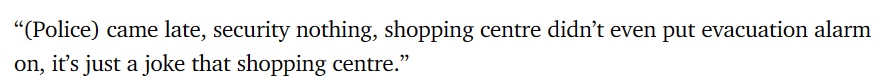 “他们就在儿童更衣室前的儿童游乐区开始了这场斗殴,我和我的三个孩子,还有另一位母亲以及她的孩子,一起跑进了婴儿更衣室里...我6岁的孩子虽然还不清楚他们在干什么,但他看到了他们挥舞着砍刀,非常害怕,浑身止不住地颤抖着...”另一名目击者表示,“购物中心甚至都没有提醒顾客注意,也没有启动紧急疏散警报,我甚至都没看到保安来,这个购物中心简直就是个笑话...警察来的也很慢,他们到的时候,那几个人早跑了...”这场斗殴并未持续太长时间,三名男子不久后就逃之夭夭了...澳洲暴力事件频发,目击者坦言:“在这里已经没有了安全感...”商场餐厅的一位工作人员就目睹了整起事件,她表示,她看到三个人从购物中心离开了,其中一人头上似乎有很多血,这可能是两个对立的青少年帮派之间的“战争”。