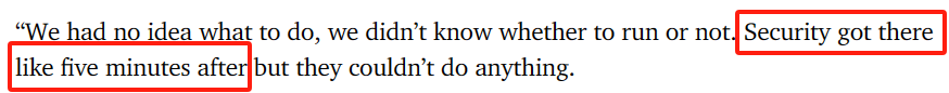 她说,“我看到他们快步朝出口走去,其中一个人似乎是把一件毛衣卷成一团按在了头上止血,他的脸上、身上有很多血...在事情发生大约5分钟后,安保人员才赶到现场,他们什么也做不了,这让我很害怕,当事情就发生在你身边时,你的安全一点保障都没有...”
